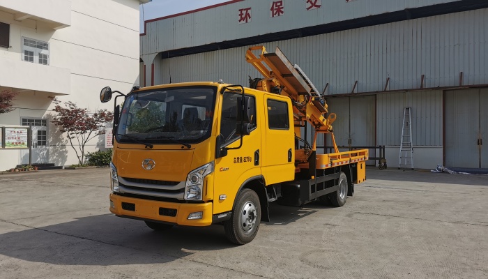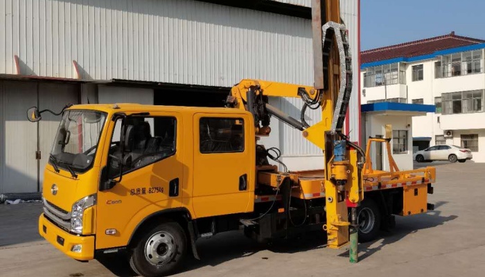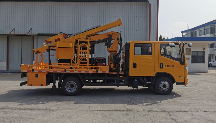 该车主要装置为护栏抢修装置,主要用于高等级公路防撞护栏进行打桩、拔桩,对左右侧护栏进行维修,该车选用 跃进SH1083ZFDDMS2底盘,125KW发动机功率大,可实现山区作业,爬坡性能好,整个工作装置动力通过底盘取 力,使用成本低,结构简单。采用全液压控制技术,易于操纵控制并实现过载保护,工作平稳、工作效率高,车载工作 平台可270°旋转,左右侧施工时,整车无需掉头。