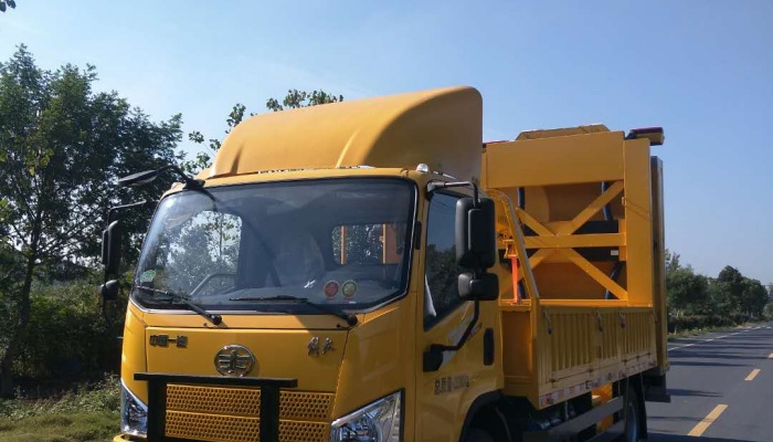 该车选用解放底盘,功率为118kw 。车辆防撞缓冲装置具有多重吸附性能,有效的吸收动能,在车辆发生碰撞时, 能有效的减少对车内乘员的冲击力,也减少对车体的冲击变形,同时防止车辆回弹,从而避免引发二次事故。防撞垫通 过国家防撞碰撞测试。