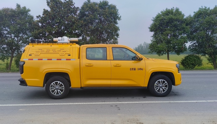 该车选用优质江铃大道国VI皮卡车底盘,在皮卡车后货箱上装配防雨厢罩。车厢内配置液压排涝抢险便携式潜水 泵,液压潜水泵、渣浆泵,适应各种抢险工况,车厢顶上可选装遥控探照灯、长排警示灯;随车配排水管、水泵控制 等。