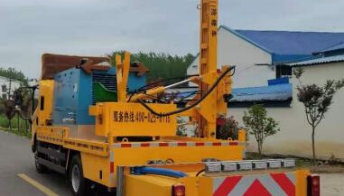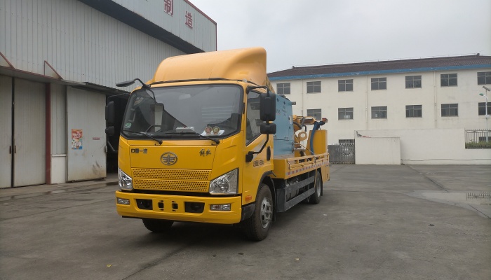 该车选用解放底盘,功率118kw 。本产品具有对高等级公路防撞护栏进行打桩、拔桩、钻孔,且可以转270度左右 旋转,左右侧施工不需要调头等功能,打、拔桩一体,可装载作业材料、安装了共四条内弧形铝管结构,当碰撞发生 时,弧形铝管将首先受力变形,吸收冲击能量。可靠性好、操作简单、维修方便、无需逆行、安全性高、工作效率高、 劳动强度低、经济实用。