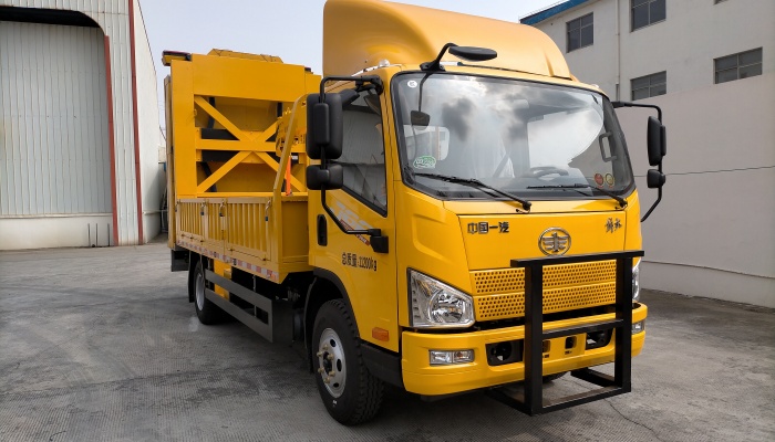 该车选用解放底盘,功率为118kw 。车辆防撞缓冲装置具有多重吸附性能,有效的吸收动能,在车辆发生碰撞时, 能有效的减少对车内乘员的冲击力,也减少对车体的冲击变形,同时防止车辆回弹,从而避免引发二次事故。防撞垫通 过国家防撞碰撞测试。