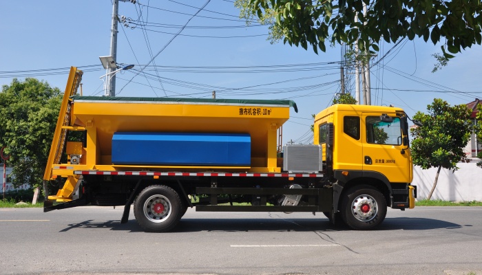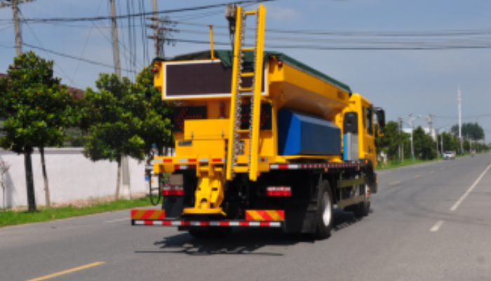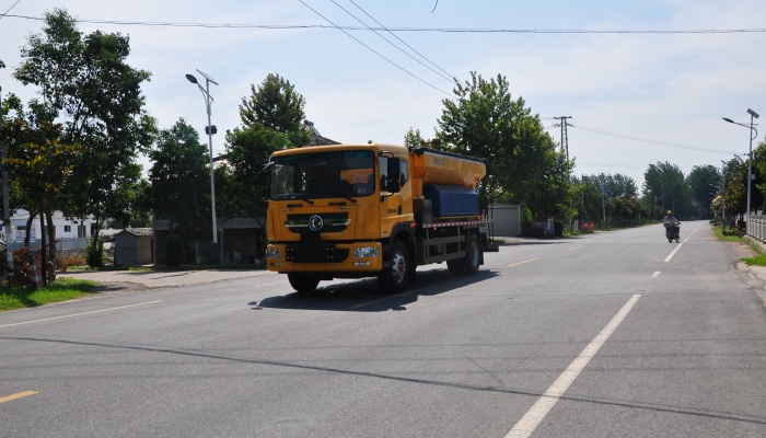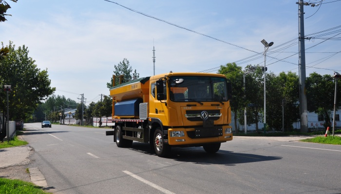 该车选用东风多利卡,功率154kw。整车一体化设计融雪撒布方便、可靠、精确,工程施工操作简单、灵活,作业 质量稳定、高效、节能、环保、安全。除雪撒布车前端可选装各种规格的除雪铲。广泛适用于高等级公路、城市道路、 机场、广场,风景区道路除雪、融雪等。