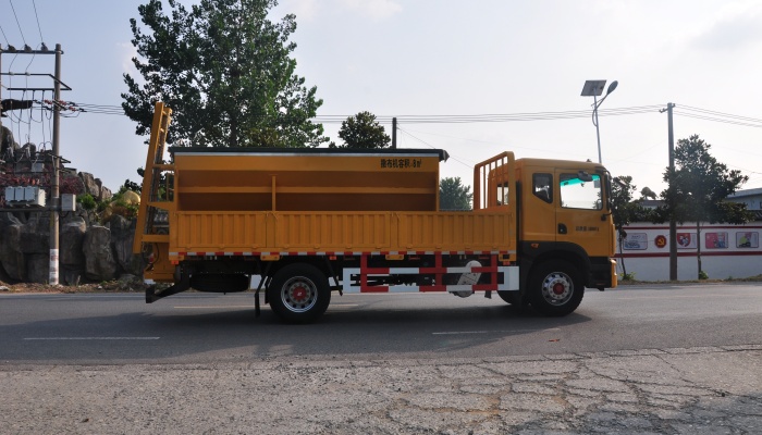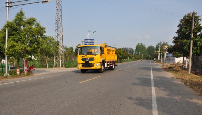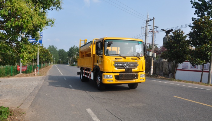 该车选用东风多利卡底盘,功率154KW。融雪撒布方便、可靠、精确,工程施工操作简单、灵活,作业质量稳 定、高效、节能、环保、安全。除雪撒布车前端可选装各种规格的除雪铲。广泛适用于高等级公路、城市道路、机场、 广场,风景区道路除雪、融雪等。