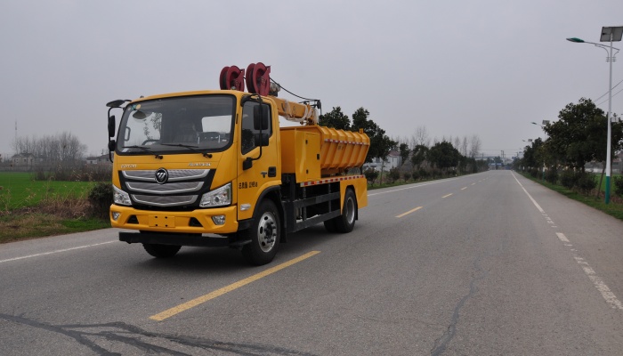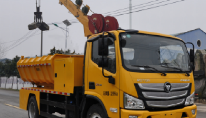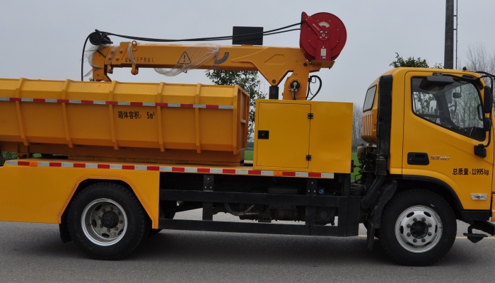 该车选用福田欧马可底盘,发动机功率为115kw, 常规的作业方式,用抓斗从沙井中抓取污泥,放至车厢内,再运